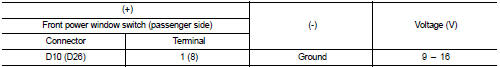 4. Check voltage between front power window switch (passenger side) harness connector and ground.