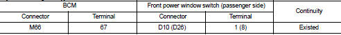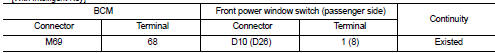 3. Check continuity between BCM harness connector and front power window switch (passenger side) harness connector.