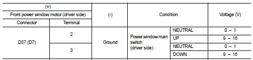 4. Check voltage between front power window motor (driver side) harness connector and ground.