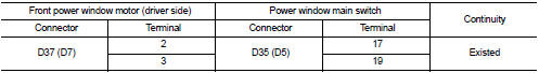 3. Check continuity between front power window motor (driver side) harness connector and power window main switch harness connector.