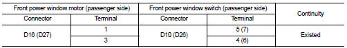 3. Check continuity between front power window motor (passenger side) harness connector and front power window switch (passenger side) harness connector.