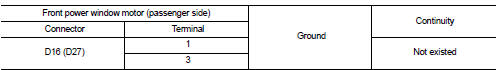 4. Check continuity between front power window motor (passenger side) harness connector and ground.
