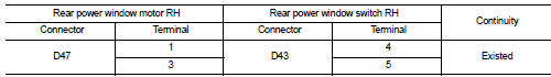 3. Check continuity between rear power window motor RH harness connector and rear power window switch RH harness connector.
