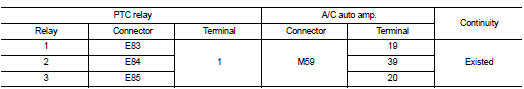 2. Check continuity between PTC relay harness connector and A/C auto amp. harness connector.