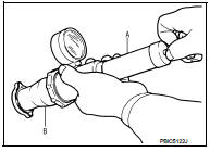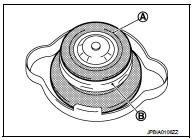 - When connecting radiator cap to the radiator cap tester (commercial service tool) (A) and the radiator cap tester adapter (commercial service tool) (B), apply engine coolant to the cap seal surface.