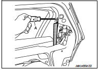 • Lower the glass slightly [approximately 10 to 20 mm (0.394 to 0.787 in)], and check that the clearance to the sash is parallel. Loosen the regulator mounting bolts, guide rail mounting bolts, and glass and guide rail mounting bolts to correct the glass position if the clearance between the glass and sash is not parallel.