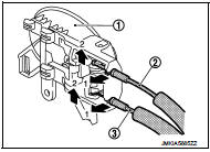 4. Disengage outside handle cable (2), and then remove outside handle cable from outside handle assembly (3).