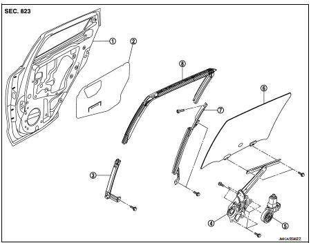 1. Remove rear door glass. Refer to GW-21, "Removal and Installation".