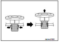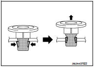 2. Push up seatback lock knob finisher while pressing pawls indicated by arrows as shown in the figure. Remove seatback lock finisher from seatback.