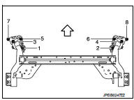 • To install rear suspension arm bracket to the vehicle, temporarily tighten the bolts before tightening to the specified torque, referring to the tightening method and the numerical order shown below: