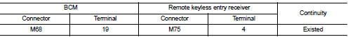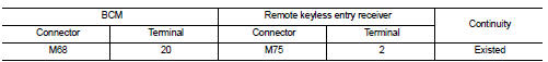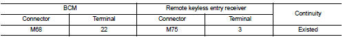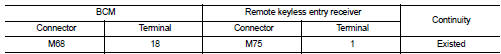 1. Disconnect BCM connector 2. Check continuity between BCM harness connector and remote keyless entry receiver harness connector.