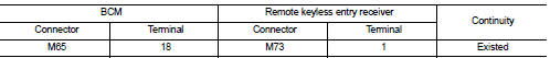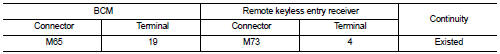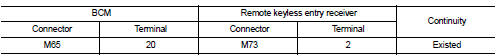 1. Disconnect BCM connector 2. Check continuity between BCM harness connector and remote keyless entry receiver harness connector