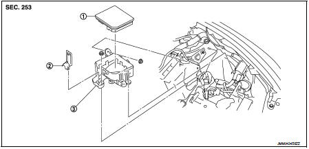 5. Insert a flat-bladed screwdriver between IPDM E/R cover A (1) and IPDM E/R cover B (2), disengage pawls, and remove IPDM E/R cover A.