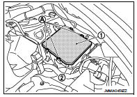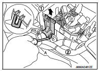 2. Press and expand pawls (A) on lateral side of IPDM E/R cover and remove IPDM E/R (1) from IPDM E/R cover B (2).