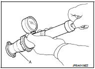 - When connecting reservoir tank cap to the radiator cap tester (commercial service tool) and the radiator cap tester adapter (commercial service tool) (A), apply engine coolant to the cap seal surface.