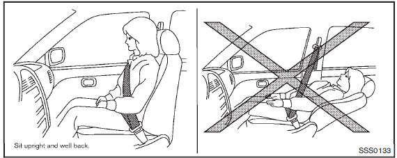 • For the most effective protection when the vehicle is in motion, the seat should be upright. Always sit well back in the seat with both feet on the floor and adjust the seat properly. See “Precautions on seat belt usage” .