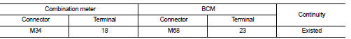 2. Check continuity between combination meter harness connector and BCM harness connector.