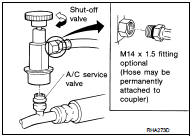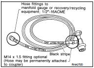 Be certain that the service hoses display the markings described (colored hose with black stripe). All hoses must equip positive shutoff devices (either manual or automatic) near the end of the hoses opposite to the manifold gauge.
