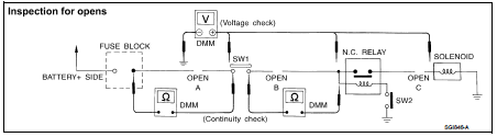no voltage: open is between relay and solenoid (point C).