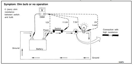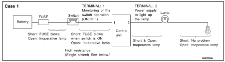 • *: If high resistance exists in the switch side circuit (caused by a single strand), terminal 1 does not detect battery voltage. Control unit does not detect the switch is ON even if the switch does not turn ON. Therefore, the control unit does not supply power to light up the lamp.