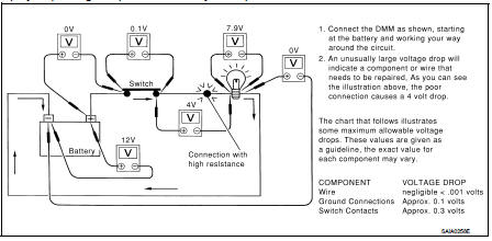 Measuring Voltage Drop — Accumulated Method • Connect the DMM across the connector or part of the circuit you want to check. The positive lead of the DMM should be closer to power and the negative lead closer to ground.