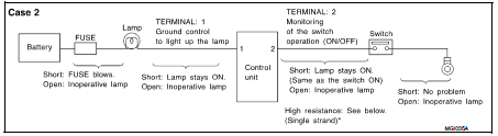 • *: If high resistance exists in the switch side circuit (caused by a single strand), terminal 2 does not detect approx. 0 V. Control unit does not detect the switch is ON even if the switch does not turn ON. Therefore, the control unit does not control ground to light up the lamp.