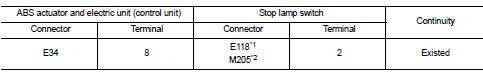 3. Check continuity between ABS actuator and electric unit (control unit) harness connector and stop lamp switch harness connector.