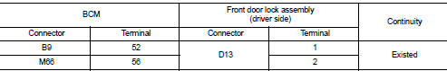 2. Check continuity between BCM harness connector and front door lock assembly (driver side) harness connector.
