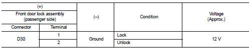 3. Check voltage between front door lock assembly (passenger side) harness connector and ground.