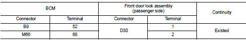 2. Check continuity between BCM harness connector and front door lock assembly (passenger side) harness connector