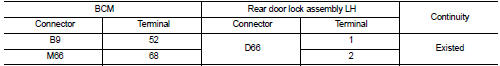 2. Check continuity between BCM harness connector and rear door lock assembly LH harness connector.