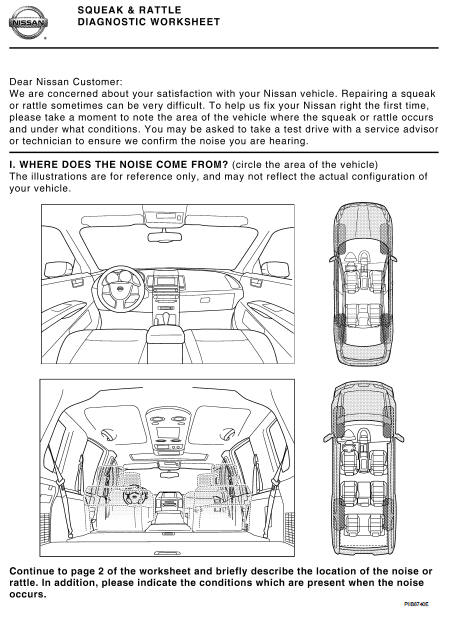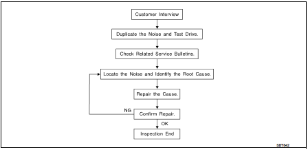 Interview the customer if possible, to determine the conditions that exist when the noise occurs. Use the Diagnostic Worksheet during the interview to document the facts and conditions when the noise occurs and any of the customer's comments; refer to EXT-10, "Diagnostic Worksheet". This information is necessary to duplicate the conditions that exist when the noise occurs.