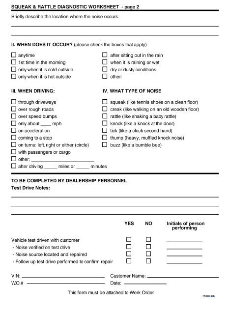 • If there is more than one noise in the vehicle, be sure to diagnose and repair the noise that the customer is concerned about. This can be accomplished by a test drive with the customer.