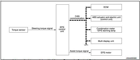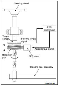 • EPS control unit performs an arithmetical operation on data, such as steering wheel turning force (sensor signal) from the torque sensor, vehicle speed signal, etc. Then it generates an optimum assist torque signal to the EPS motor according to the driving condition.