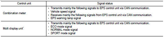 • In SPORT mode, changes the steering assist characteristic to enhance a stable steering feel according to the mode signals from multi display unit via CAN communication. (Models with Nissan Dynamic Control System)