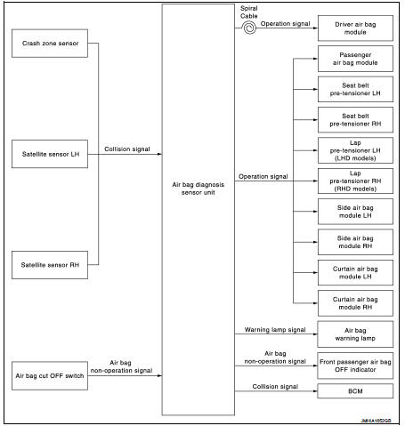 Air bag diagnosis sensor unit supplies power supply to air bag module and pre-tensioner seat belt when deceleration that is more than the specified limit is detected by G sensor in air bag diagnosis sensor unit, crash zone sensor, satellite sensor.