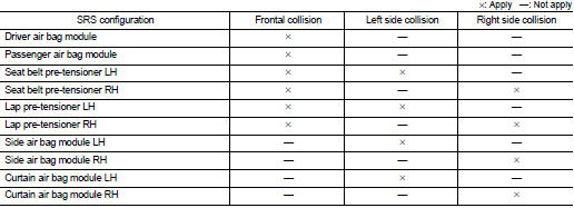 The operation of SRS is different depending on the collision modes applications. For example, the driver air bag module, passenger air bag module, and seat belt pre-tensioner are activated in a frontal collision or side collision.