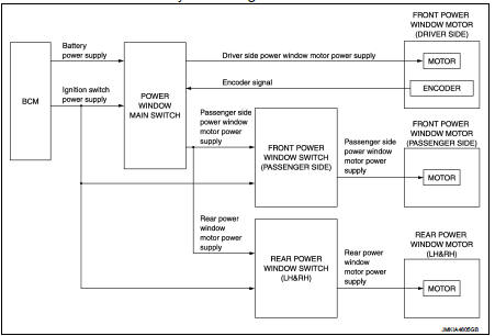 • Power window system is activated by power window switch when ignition switch turns ON.