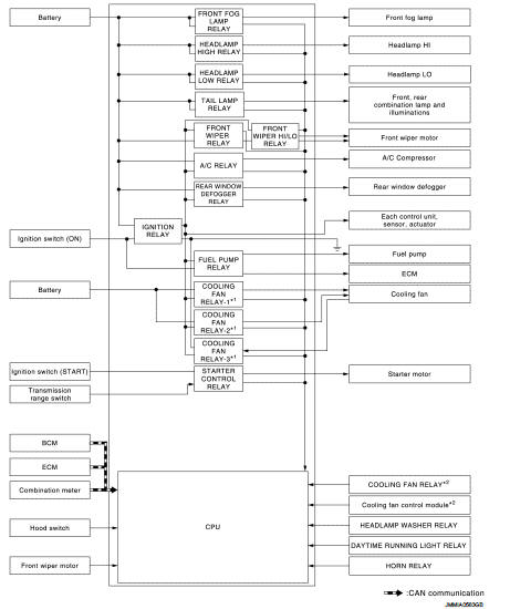• IPDM E/R reads the status of the hood switch and transmits the hood switch signal to BCM via CAN communication.