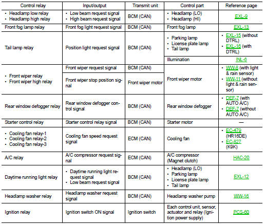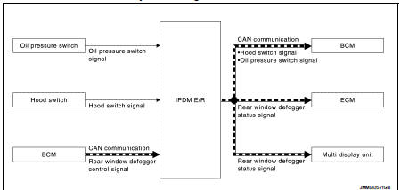 • IPDM E/R receives the rear window defogger control signal from BCM via CAN communication and transmits the rear window defogger status signal to ECM and multi display unit via CAN communication. Refer to DEF-7, "WITH AUTO A/C : System Diagram" (with AUTO A/C) or DEF-7, "WITHOUT AUTO A/C : System Diagram" (without AUTO A/C).