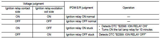 • IPDM E/R judges the ignition relay error if the voltage differs between the contact circuit and the excitation coil circuit.