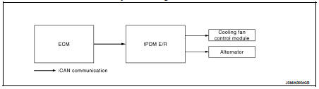 IPDM E/R outputs power generation command signal (PWM signal) to the alternator according to the status of the power generation command value signal received from ECM via CAN communication. Refer to CHG-9, "POWER GENERATION VOLTAGE VARIABLE CONTROL SYSTEM : System Diagram (Gasoline Engine Models)".