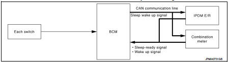 • IPDM E/R stops CAN communication and enters the low power consumption mode when it receives a sleep wake up signal (sleep) from BCM and the sleep-ready conditions are fulfilled.