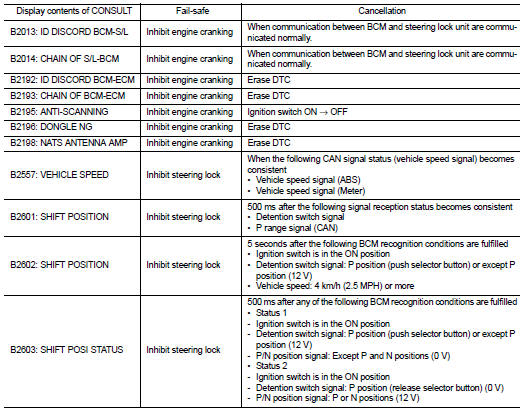Steering is locked by steering lock unit when ignition switch is in the OFF position, selector lever is in the P position and any of the following conditions are met.