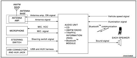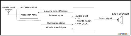 • Radio signals are received by radio antenna, next they are amplified by antenna amp., and finally the they are input to audio unit. (Antenna amp. is built into antenna base.) • Audio unit outputs the sound signal to each speaker.