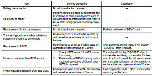When The Radio Is Locked In case of the audio unit being linked with the vehicle's NATS (immobilizer system), disconnection of the link between the audio unit and the BCM will cause the audio unit to switch into the lock (“SECURE”) mode in which the audio unit is fully inoperative. Hence, repair of the audio unit is basically impossible, unless the audio unit is reset to the “NEW” state for which special decoding equipment is required.