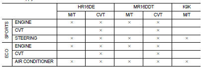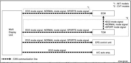 • Based on the mode signals received from TCM (CVT models) or multi display unit (M/T models) via CAN communication, ECM changes over the throttle position and other characteristics.