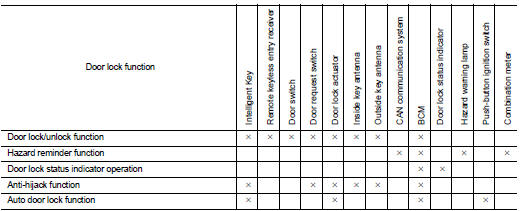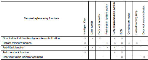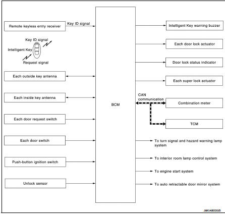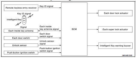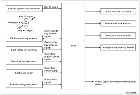• When door lock/unlock button of the Intelligent Key is pressed, lock signal or unlock signal transmitted from Intelligent Key to BCM via remote keyless entry receiver.