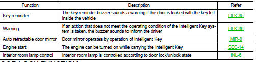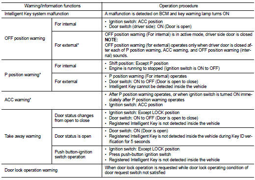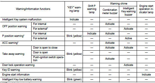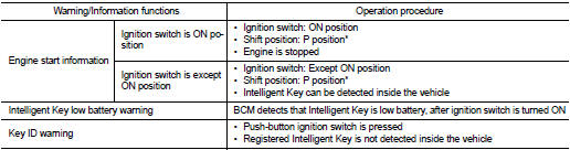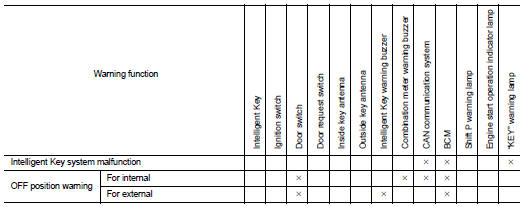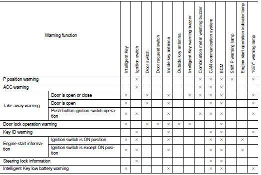 The warning function are as per the following items and are given to the user as warning information and warnings using combinations of Intelligent Key warning buzzer, combination meter buzzer, KEY warning lamp, shift P warning lamp and engine start operation indicator lamp.