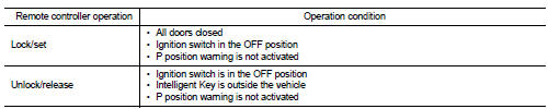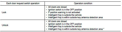 If the following condition are satisfied, remote keyless entry operation is performed when the Intelligent Key is operated.